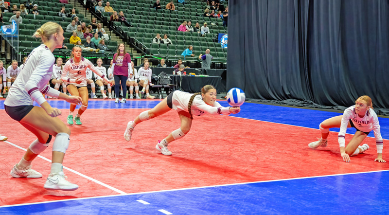 Chatfield’s Cora Bicknese dives to save a ball versus Hawley in a state semifinal match as teammates Jaelyn LaPlante (right) and Trindy Barkeim (left) look on. The Gophers led 2-1 but fell 3-2 in a hard-fought contest. Photo by Leif Erickson