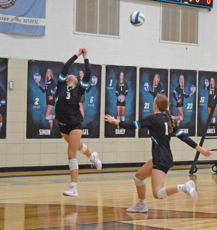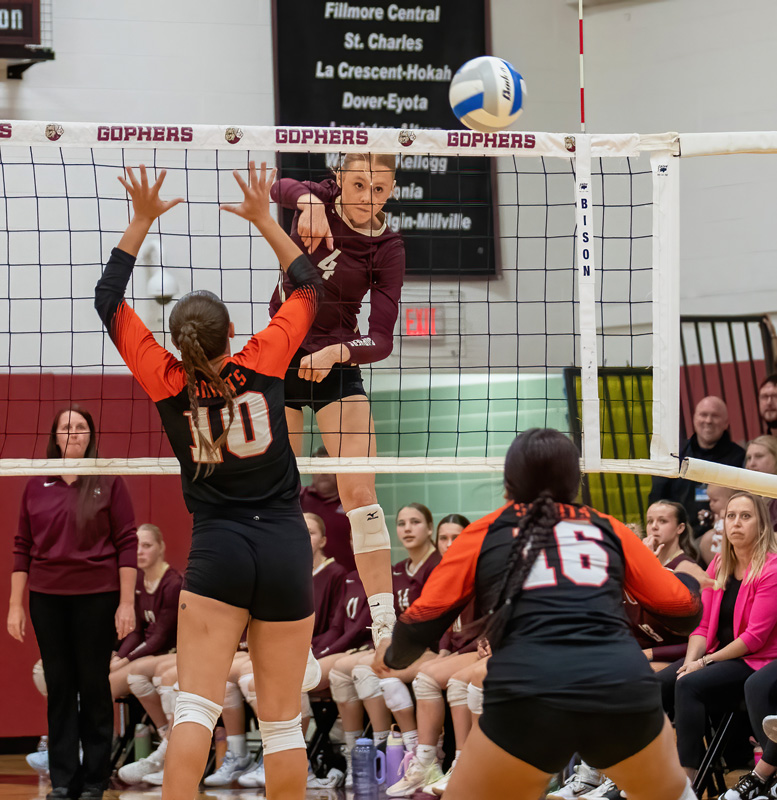 15-seed Blooming Prairie (8-21) 0, 2-seed Spring Grove (21-7) 3 > 25-13, 25-17, 25-16 (SG: Kendal VanMinsel 6 kills, 34 assists, 6 digs; Jordis Neeley 10 kills, 2 blocks, 2 aces; Joelle Halverson 12 kills; Emerson Ingvalson 8 kills, 6 digs, 13-13 serving; Brinley Middendorf 5 kills; Sydney Holland 16 digs. Kills: SG 45, BP 19)