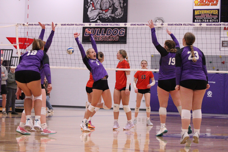Playing a competitive 1A Round of 16 volleyball playoff contest were 9-seed Lanesboro (17-13) and 8-seed Grand Meadow (15-13). Control mostly went from one team without too much fluctuation. Matt Rosaaen’s Larks led start to finish for a game one 25-11 win, as the Burros found their footing with a new setter. In set two, they did so, leading from start to finish for a 25-20 win. Lanesboro then stayed in control early in game three, leading 15-9. But a Lark 6-0 run tied the match at 15. GM taking a 17-16 lead was their first since set one. After six ties, Lark junior setter Hallie Hendrickson scored with a kill and an ace in succession for the 25-23 win. GM then led most of game four. With Lanesboro up 13-11, the Larks scored seven straight points, six coming while Hendrickson served. They went ahead 18-11 and closed out the set 25-21. They took the match 3-1 (25-11, 20-25, 25-23, 25-21) to make it back to Rochester for the first time since 2018. Hendrickson (3 kills, 33 assists, 8 digs, 22-23 serving, 3 aces), Gracie Foster (12 kills, 25 digs), Lauren Queensland (9 kills, 14 digs, 19-19 serving, 2 aces), and Cheyenne Bakken (19 digs) did big work. Kendall Jack (8 kills), Haylie Paul (6 kills, 7 digs), and Rylee Schaufler (5 kills, 6 digs) helped. Queensland picked up her 1,000th career dig. The Burros were led by Jensyn Storhoff (14 kills, 24 digs) and new setter Emma Ruen (29 assists, 23 digs). Taylor Hanson (6 kills, 4 aces, 3 total blocks), Jentrey Schreiber (5 kills), and Ellie Howard (17 digs) helped. GM improved to 16-13. The Burros finish at 17-14.