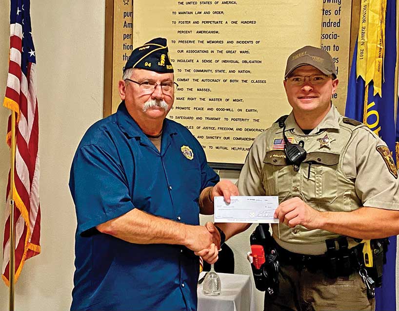 Commander Tom Butterfield of the Rushford American Legion presents Fillmore County Deputy Dalton Bellock with a DARE donation check. Photo submitted