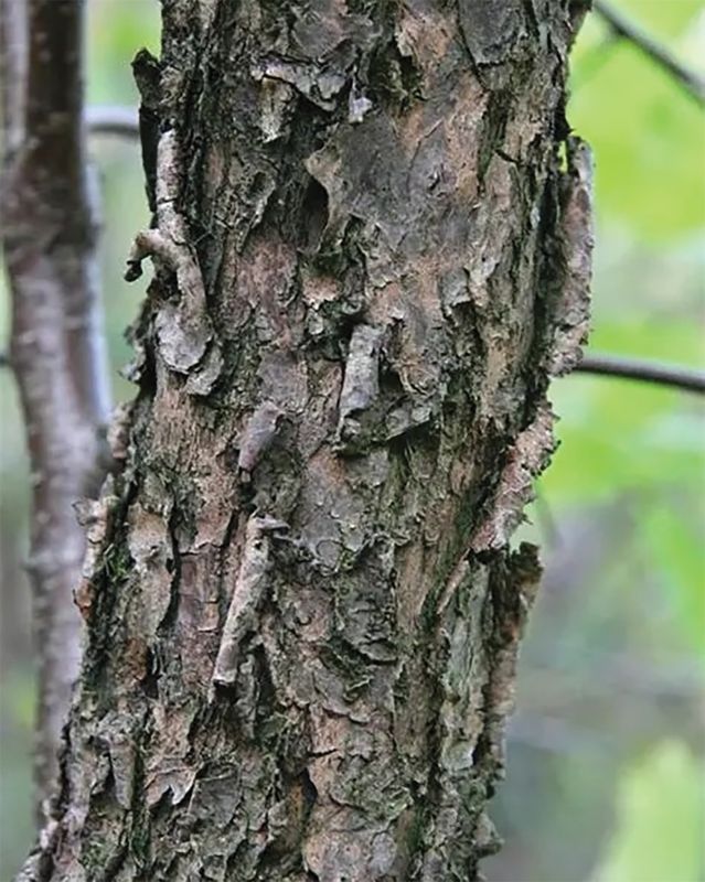 Bark: Gray or dark brown. Appears black and shaggy the older the shrub gets.