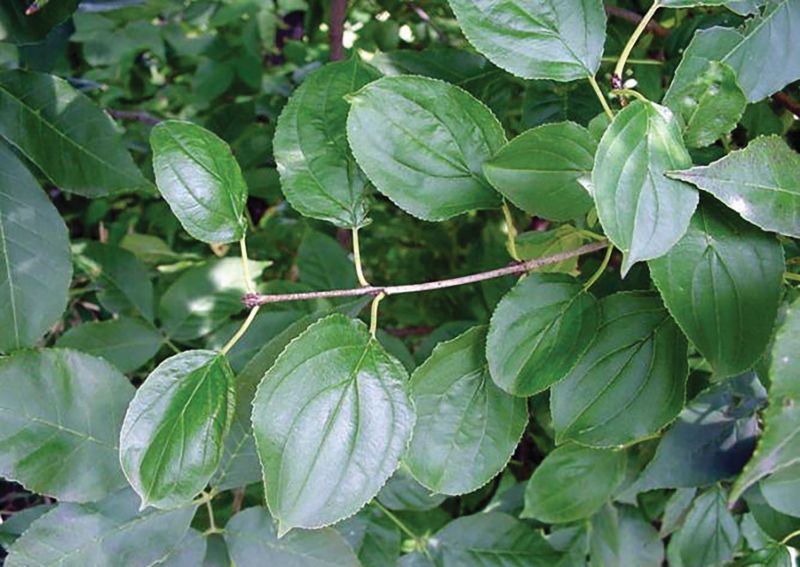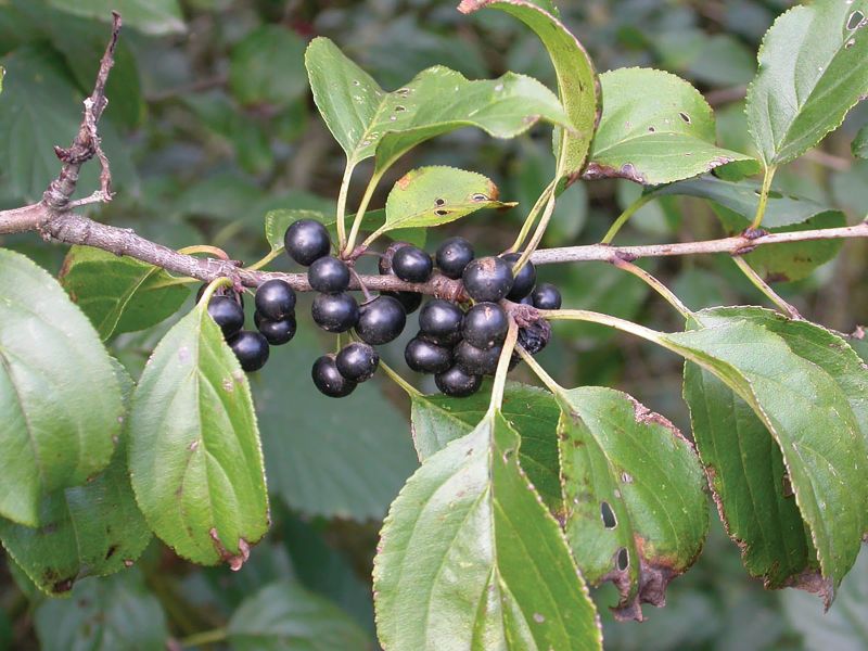 Native to Europe, Common Buckthorn has become a common issue for landowners all over the state, in the past decade or so. This tall understory shrub (up to 25 feet tall) grows in dense thickets, which shade out native understory species, in most cases leaving only bare soil beneath. This can lead to erosion issues, decreased habitat for native animal/insect species and conditions for native plant species. It spreads quickly due to its prolific berry production, with each berry containing up to four seeds. The seeds create a laxative effect on the birds that consume them, which leads to increased rate of spread. It is worth noting, that Common Buckthorn is the overwintering host species for Soybean Aphids. Buckthorn can resemble native cherry and plum species, so it is important to make sure to identify them correctly. Below are some ways to identify this species.