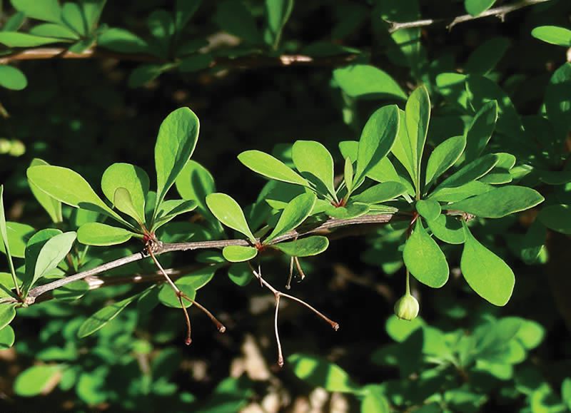 This small to medium shrub can grow 3-6 feet tall. It has slightly arching stems that are covered in clusters of leaves and spines. Once established in an area, it can become very dense, outcompeting native vegetation and taking over the understory. It has glossy green leaf clusters that burn a reddish brown in the fall. The plants produce red berries that are spread about by animal/bird consumption. These berries will appear on the plants in late summer and will hold them throughout winter. Areas with dense stands of Japanese Barberry often see increased numbers of ticks. Can sometimes be confused with native Gooseberry species, but they have quite different leaf shape. Some identifying characteristics listed below.