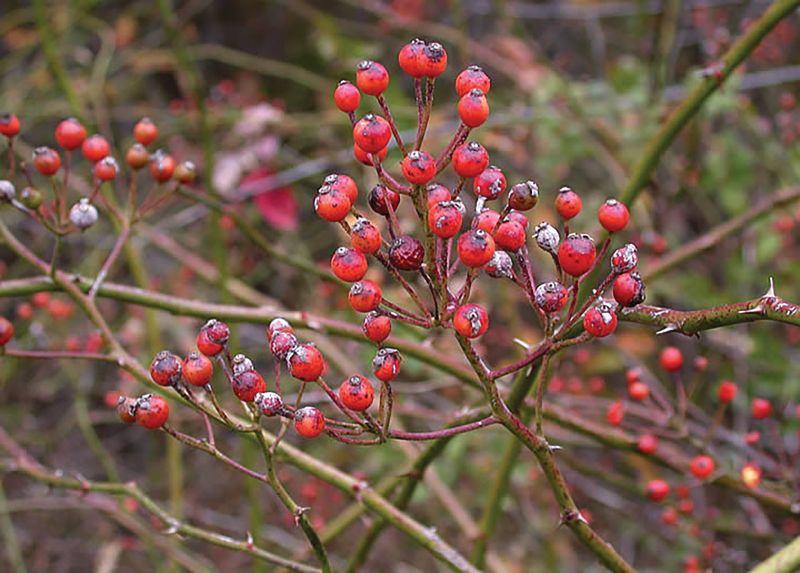 Multiflora Rose is one you will not forget if you have made contact with, due to its nasty thorns. A perennial shrub, native to eastern Asia, that can grow up to 13 feet tall and 13 feet wide. It can grow densely, making navigating stands of them difficult. It also outcompetes native vegetation in the areas it grows. It can be found in just about any setting, from wooded areas to open pasture and fence rows. Mature shrubs have arching stems covered in sharp thorns. It produces reddish brown fruits that contain the seeds, which are consumed and spread by birds. Each plant can produce up to 500,000 seeds per year. They can also spread by vegetative means, when arching stems reach the ground they take root. The plants are much more noticeable in May-June when they are flowering. The flowers petals are white, sometimes with a slight pink hue. Below are some ways to identify this plant.