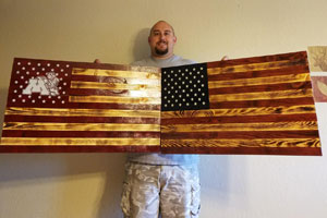 Brad prefers rustic barnwood, recycled lumber and other such types of wood, using it to build furniture, shelves, wooden flags, etc. “I try to keep up with the trends,” he said.