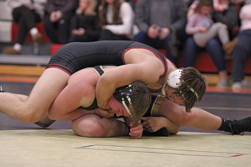 Triton Triangular > FCLMC 64, Wabasha-Kellogg 18 (The Wolves took forfeits at 107 (Ben Norby), 133 (Charles Guma), 152 (William Boettcher), 189 (Cole Sass), 215 (James Cullen), and 285 (Beau Lacey). Nolan Eide (139), and Kane Larson (172) won by fall, August Pfeffer (121) and Quinci Kaase (160) by 18-3 and 21-3 tech falls); FCLMC 30, Triton 40 (A tight dual throughout saw FCLMC take its second lead at 30-28 following a Cole Sass pin at 189. But the Wolves forfeited 215 and fell by fall at 285. Pfeffer (121) and Larson (172) also had pins. Eide (139) won by forfeit. Hovland (114) and Kaase (160 won 12-5 and 4-1 decisions. FCLMC also forfeited 145)