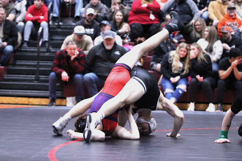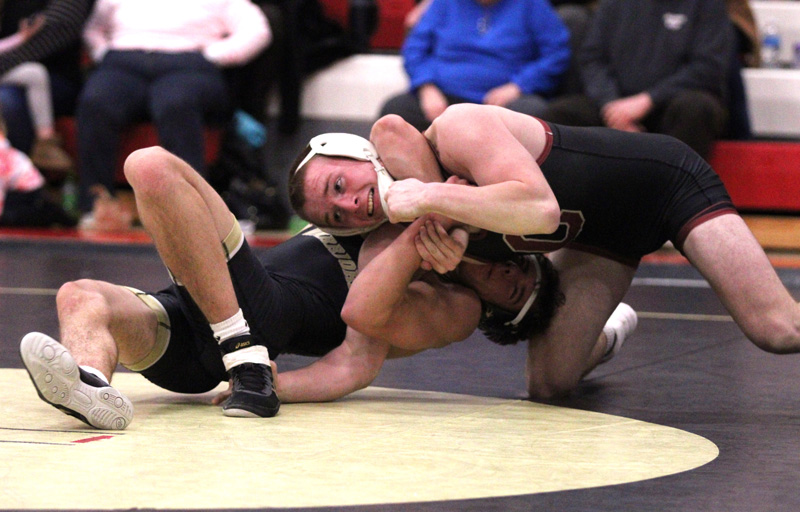 Decorah 37, Caledonia/Houston 31 (The teams split the first six weights with Decorah ahead 18-15. The Vikings then built a 37-21 lead after 189. Aiden Burns (114) and Max Schmitz (172) had pins for the Warriors, Walker Kohlmeyer (121) and Anthony VonArx (285) won by forfeit, Aden Kulas (215) by 8-0 major, and Braxton Lange (139) by 8-7 decision)