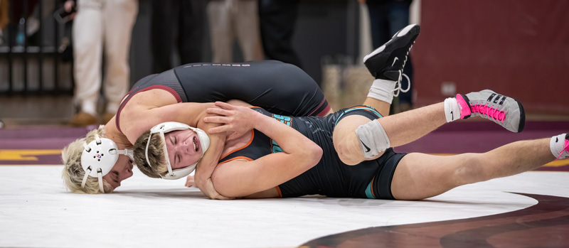 Chatfield at the Dover-Eyota triangular with FCLMC also was a Gopher sweep. Chatfield took out the Wolves 65-9, aided by forfeits at 107 (Priebe), 114 (L-Pearson), 127 (Johnson), 133 (Root), and 139 (Polikowsky). Berg (121), A-Pearson (145), Rowland (152), Boelter (215), and Ramaker (285) had first period pins. Ayden Miner (160) won a 17-1 tech fall. FCLMC got a pin from Cole Sass (189) while #2 Kane Larson beat #3 Ben Carrier (172) by 7-5 decision. Carrier topped Larson 11-8 in the FCLMC tourney finals earlier this year. Chatfield also dominated Dover-Eyota 57-10. Priebe (107), L-Pearson (114), Johnson (127), Polikowsky (139), A-Pearson (145), Rowland (152), Carrier (172), and Boelter (215) had pins. Miner (160) won an 18-3 tech fall, his 18th of the season. He has scored a team-best 406 points. Two of Chatfield’s losses were by decision, Caden Haag (133) over Root 14-9, Piercen Allen (285) over Ramaker 13-7. The Gophers are 6-0 in the TRC, 12-2 overall. FCLMC hung with the Eagles in the triangular’s first match-up. Wins by Larson (fall) and Sass (17-1 tech fall) at 172 and 189 cut the D-E lead to 36-29. The Eagles got pins at 215 and 285 for the 48-29 win. Ben Norby (107), Beckett Hovland (114), and William Boettcher (152) also had pins for the Wolves (1-4, 3-12). Forfeits at 133 and 139 hurt the FCLMC cause.