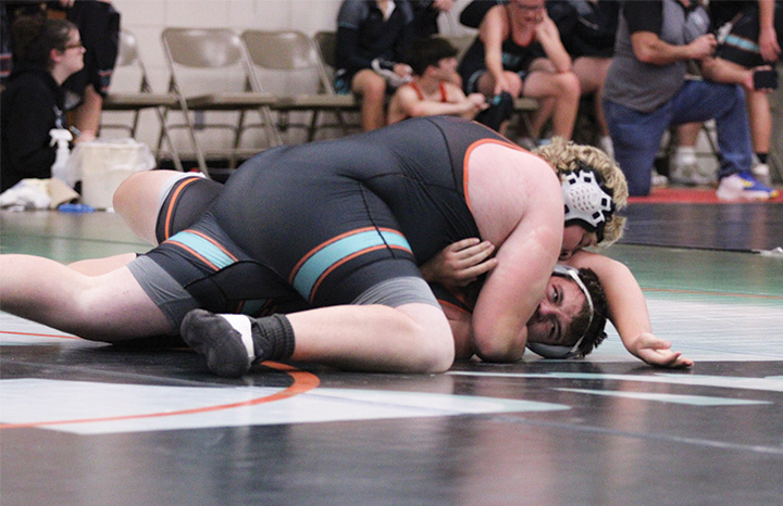 In maybe FCLMC’s best win at their home triangular, Beau Lacey works for a pin on St. Charles’ Tucker Larson. Lacey trailed 7-0 (and was nearly pinned himself) before posting the second period stick. Photo by Paul Trende