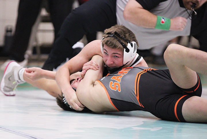 LARP’s Zach Plank has top position on FCLMC’s Cole Sass in the team’s dual at the Wolves’ triangular. Plank authored a third period pin in the match, as the S-Eagles swept the Wolves and St. Charles, then went 5-0 at the Spamtown Duals to start the season 7-0.