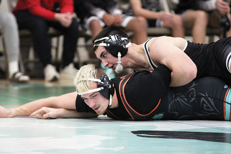LARP’s Zach Plank has top position on FCLMC’s Cole Sass in the team’s dual at the Wolves’ triangular. Plank authored a third period pin in the match, as the S-Eagles swept the Wolves and St. Charles, then went 5-0 at the Spamtown Duals to start the season 7-0. Photo by Paul Trende