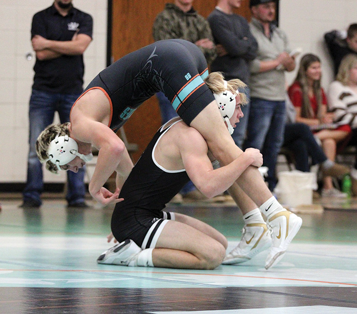 LARP’s Carter Cady looks to turn and spill FCLMC’s Quinci Kaase at the Wolves’ home triangular. Cady posted a 19-3 tech fall win in the match, as the Screamin’ Eagles took the dual 64-12. Photo by Paul Trende