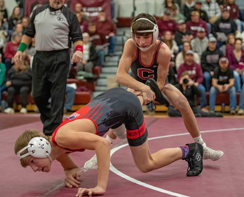 FCLMC Triangular > La Crescent/Hokah 12, FCLMC 61 (Ben Norby (107), Beckett Hovland (114), Brady Arnold (127), Ashton Newman (145), William Boetcher (160), Kane Larson (172), Cole Sass (189), and James Cullen (285) had falls for the Wolves. August Pfeffer (121) won by forfeit, Grant Daniels (139) by 17-7 major decision, Quinci Kaase (160) by 10-9 decision); Wabasha-Kellogg 24, FCLMC 49 (W-K won four of the first five to lead 24-6, but FCLMC then won out. Cooper Hovland (215) and Cullen (285) had pins. Norby (107), Boettcher (152), and Larson (172) won by forfeit. Daniels (139), Kaase (160) and Sass (189) won 18-3, 20-3, and 17-0 tech falls, Newman (145) a 10-0 major decision. Wolves > 3-6, 5-15)