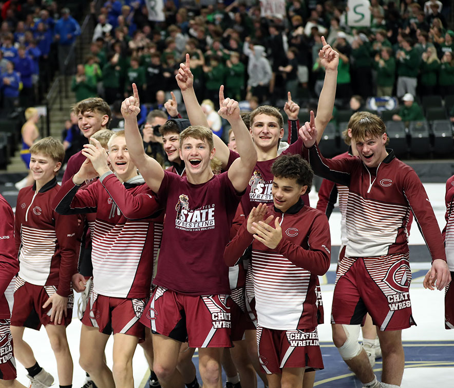 Chatfield’s Wyatt Jacobson, Carson Rowland, Ayden Miner, Javier Berg, and Kail Schott are prominent in celebrating the Gopher’s state Class A wrestling title. Photo by Leif Erickson
